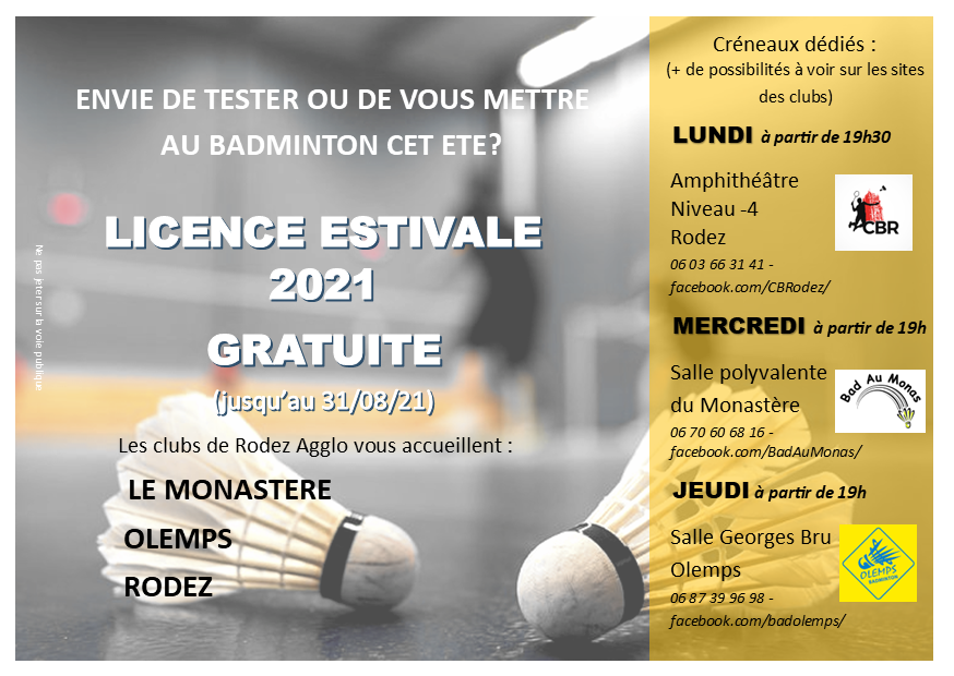 A compter du lundi 28 juin, les clubs fédérés de l’agglomération ruthénoise accueilleront le public souhaitant découvrir le badminton lors de créneaux dédiés (+ de possibilités à voir sur les sites respectifs) :