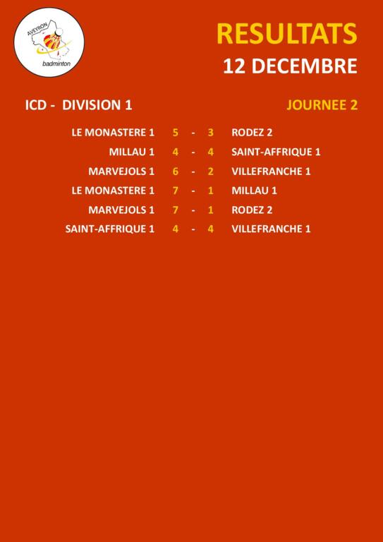 La seconde journée des rencontres ICD a eu lieu dimanche 12 décembre à Millau. Seule la division 1 jouée ; voici les résultats.