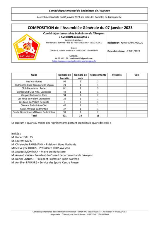 Samedi 07 janvier 2023 à 14h30 le comité réunira son AG à la salle des Combles de Baraqueville (mairie R+2)