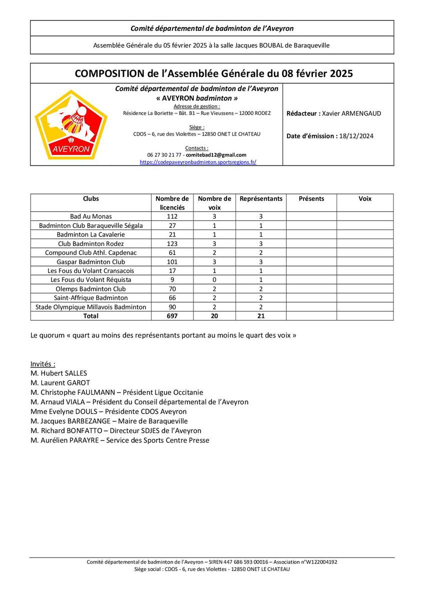 Samedi 08 février 2025 à 14h30 le Comité réunira son AG à la salle Jacques Boubal de Baraqueville (mairie R+2)